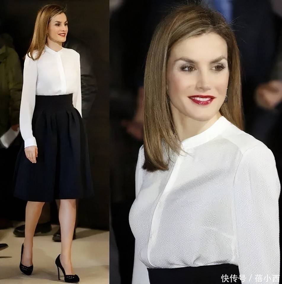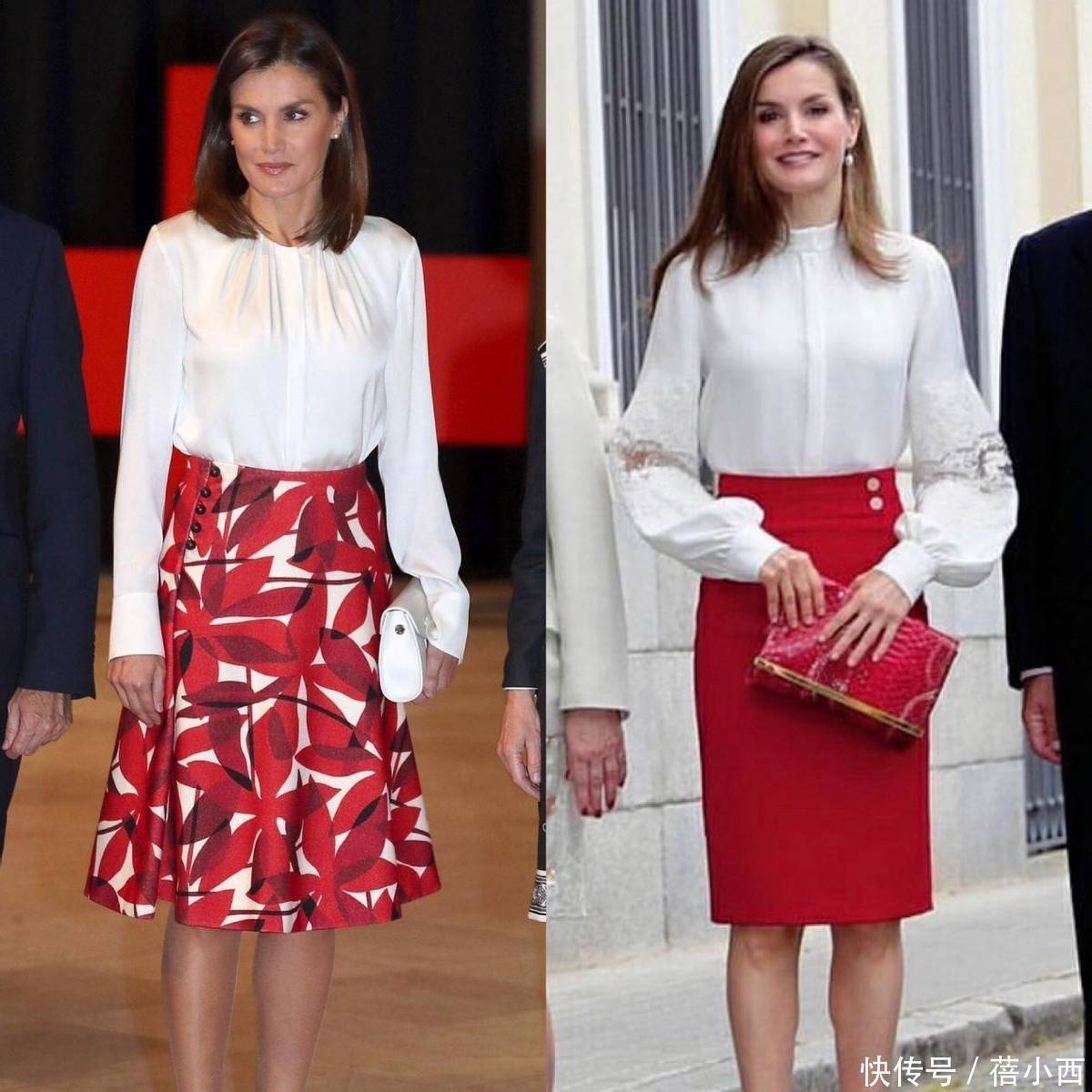 如果说九分裤赋予了白衬衫干练的气质,那么半身裙则让成熟女性的优雅与温柔发挥到了极致,这也是西班牙王后最爱的搭配之一。她的半身裙选择,始终与白衬衫的简约相契合,比如红白相间的印花半身裙,自带女人味,搭配白衬衫则能削弱油腻感。