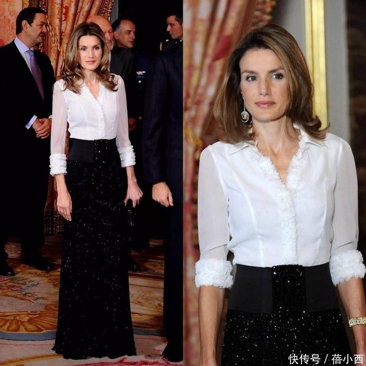 黑白配是永不过时的配色,西班牙王后这套搭配就以经典黑白配色演绎了优雅感。上身选用白色雪纺衬衫,V领设计搭配精致褶皱边饰,增添了女性柔美气质,透视面料隐约展现了肌肤,可以平衡庄重与轻盈。下装是高腰黑色亮片长裙,密集的闪片在灯光下折射出华丽光泽,修饰身形的同时还可以凸显高贵气场。