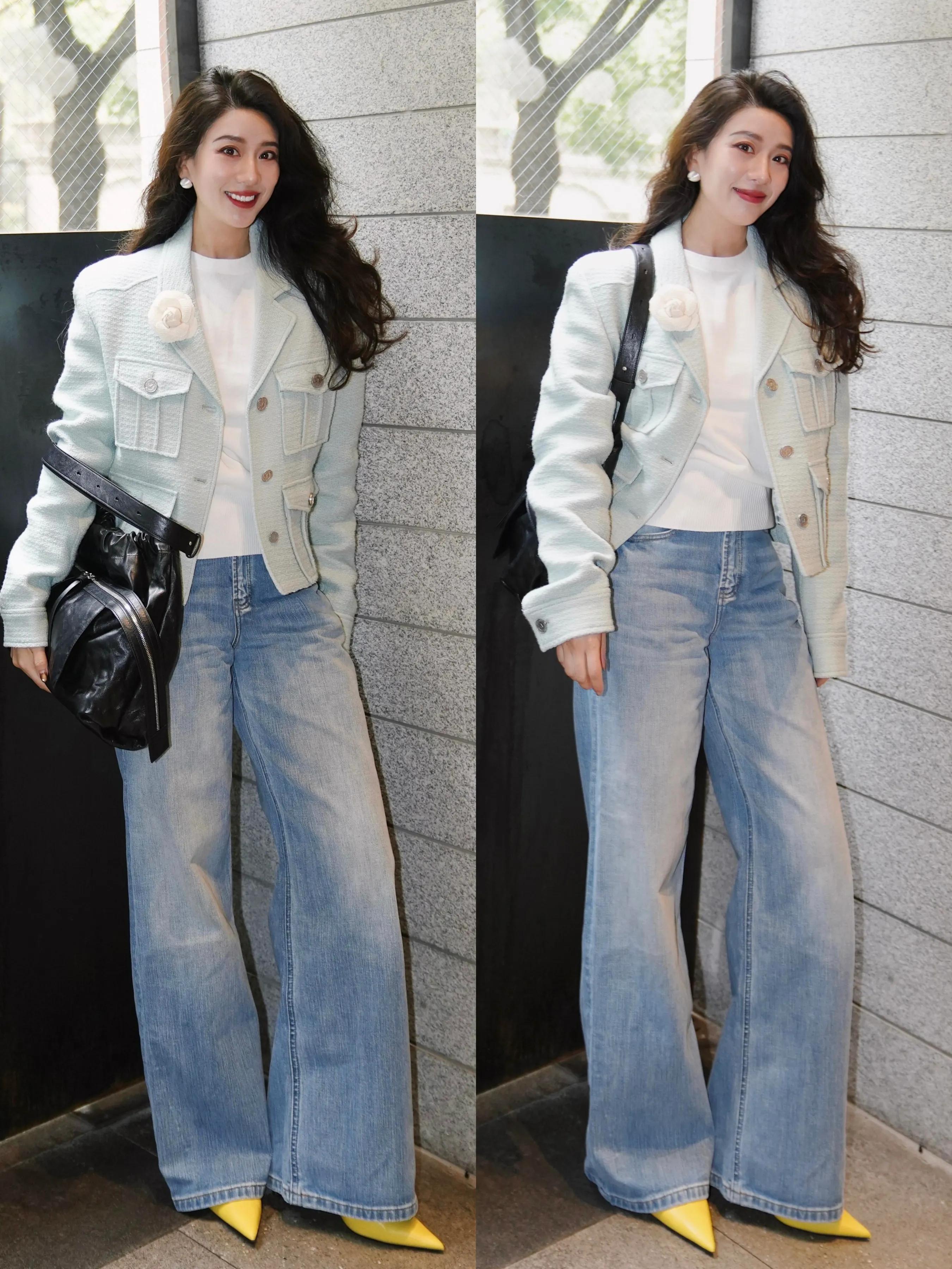 偏爱精致又高级的穿衣风格,不妨换成一件浅绿色的小香风外套,配上白色打底衫或者是 T 恤,下半身用一条微喇叭的牛仔直筒阔腿裤,脚踩鹅黄色的尖头高跟鞋,简约又不失高级感。