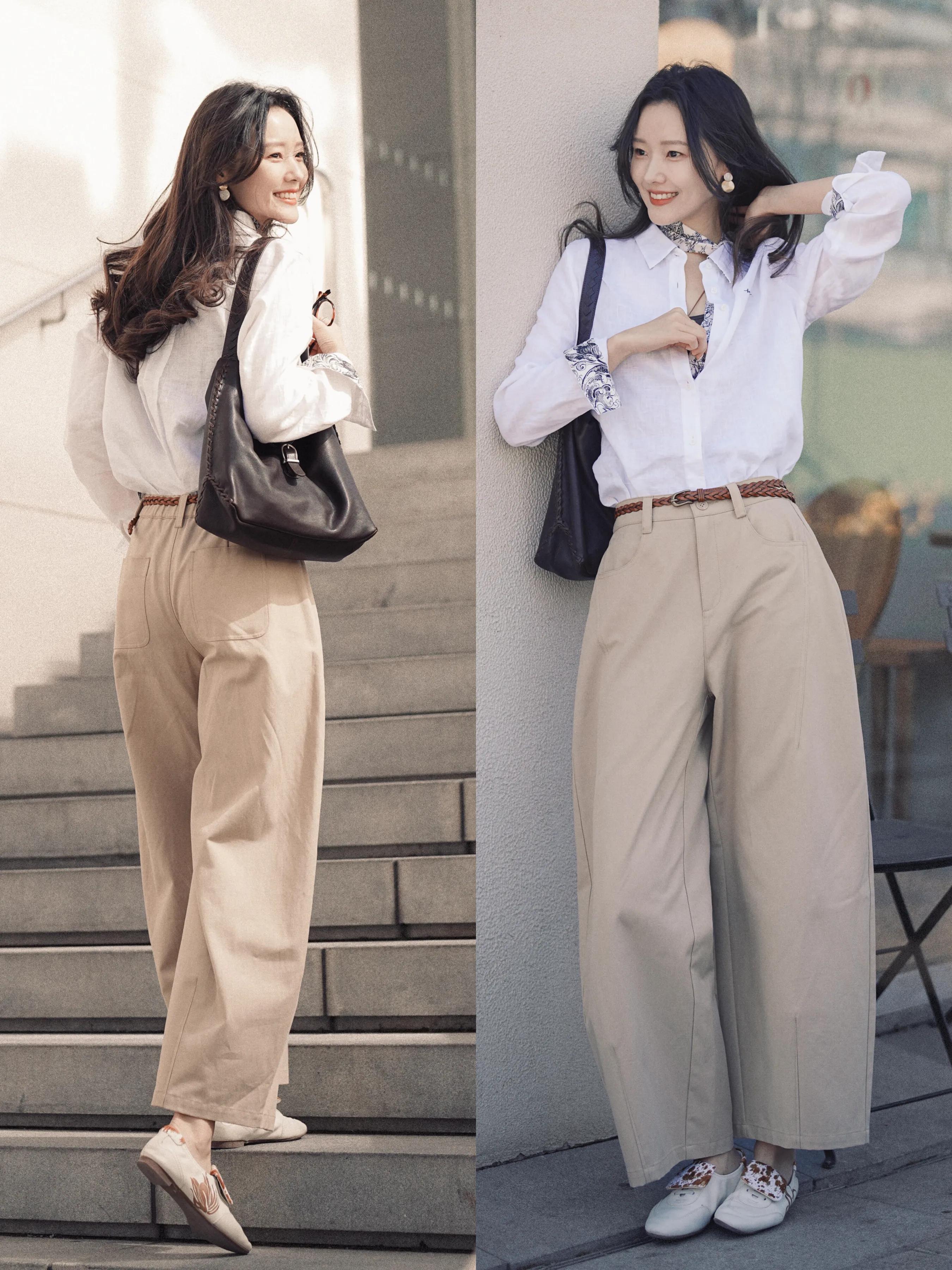穿平底的单鞋,裤脚不能过长,像上面穿的卡其色的 9 分裤,露出脚踝,上身效果不压个子,配上白色衬衫,利落又不失细节感,轻松让你穿出法式的慵懒造型,美出新的高度。
