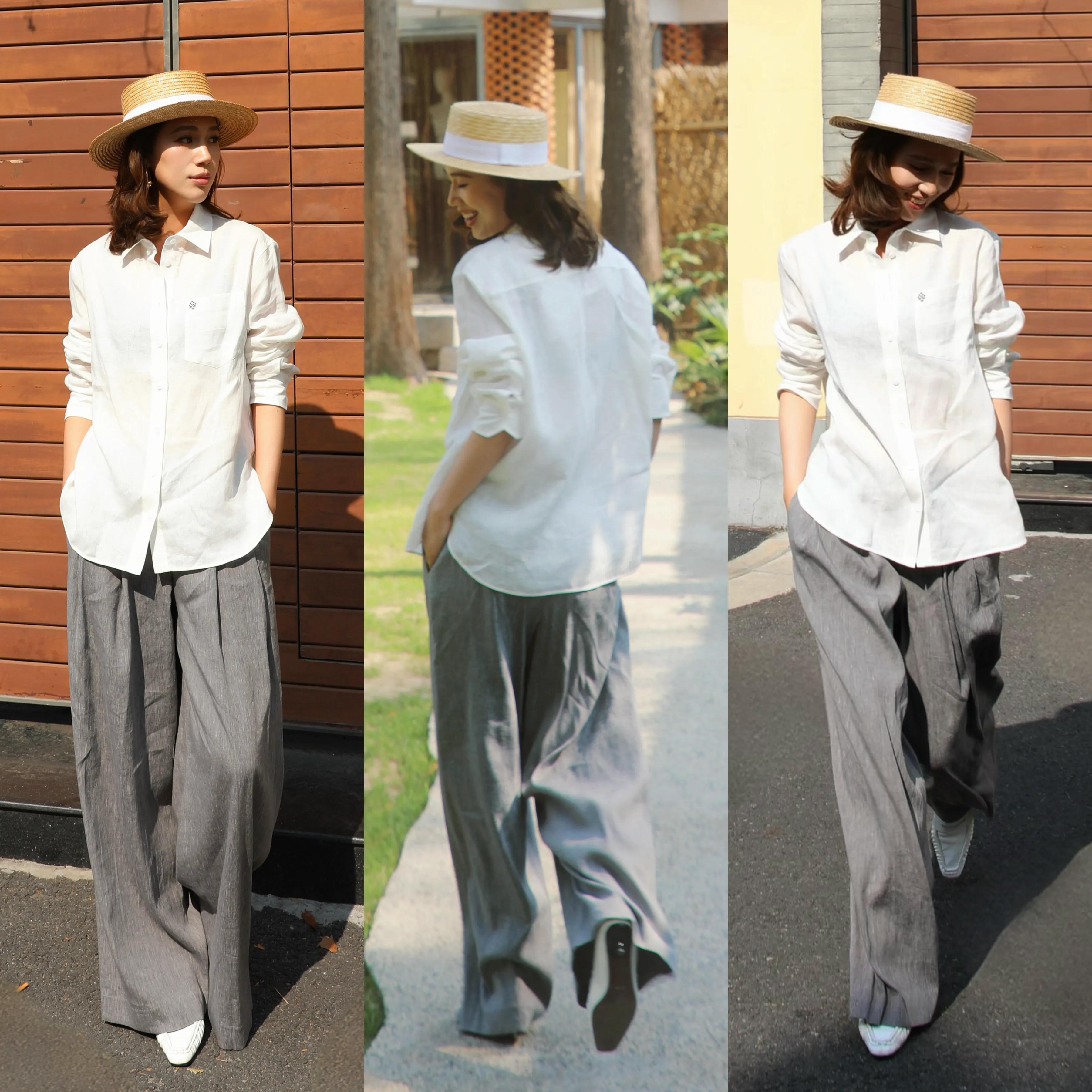 若是想要穿出通勤风,可选一条灰色的西装阔腿裤,面料要柔软,穿在身上有垂坠感,配上经典的白色微宽松衬衫上衣,就可让你呈现通勤干练的造型,配上一顶草帽,氛围感直接拉满。
