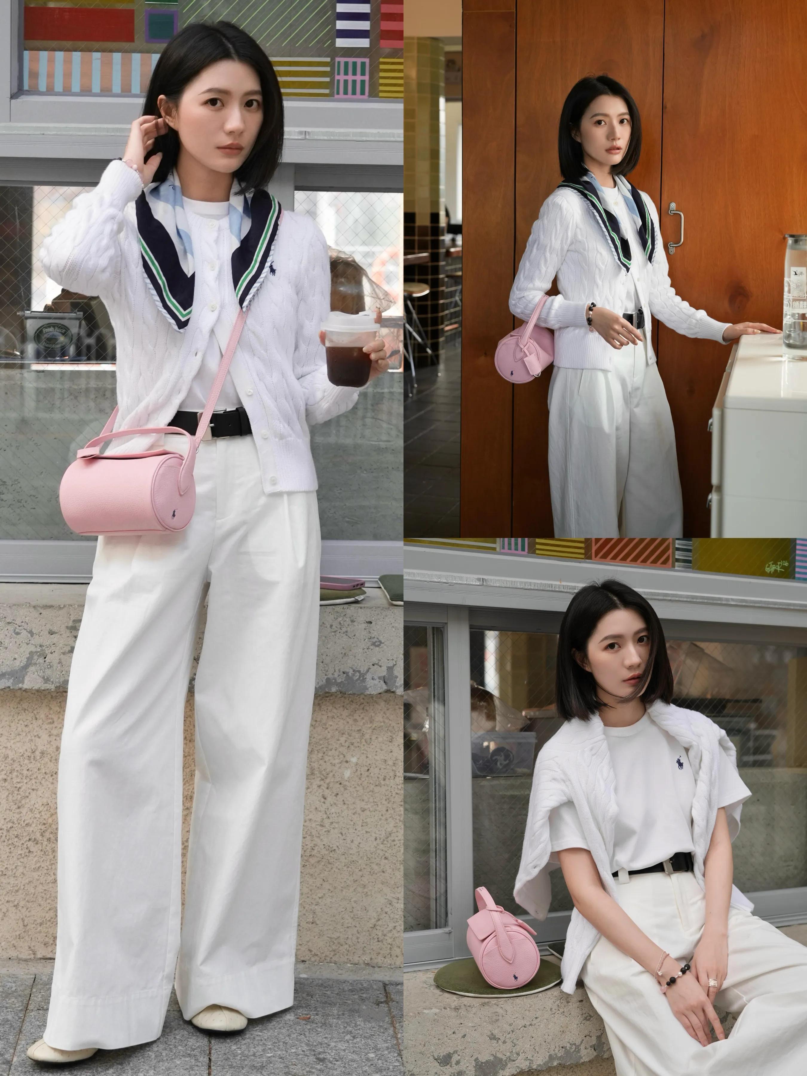咱们就看上面,用一件短款的针织开衫内搭白 T 恤和一条白色的阔腿裤,脚上穿的也是白色的平底单鞋。但整个人的身材比例就很好,也能拥有大长腿。