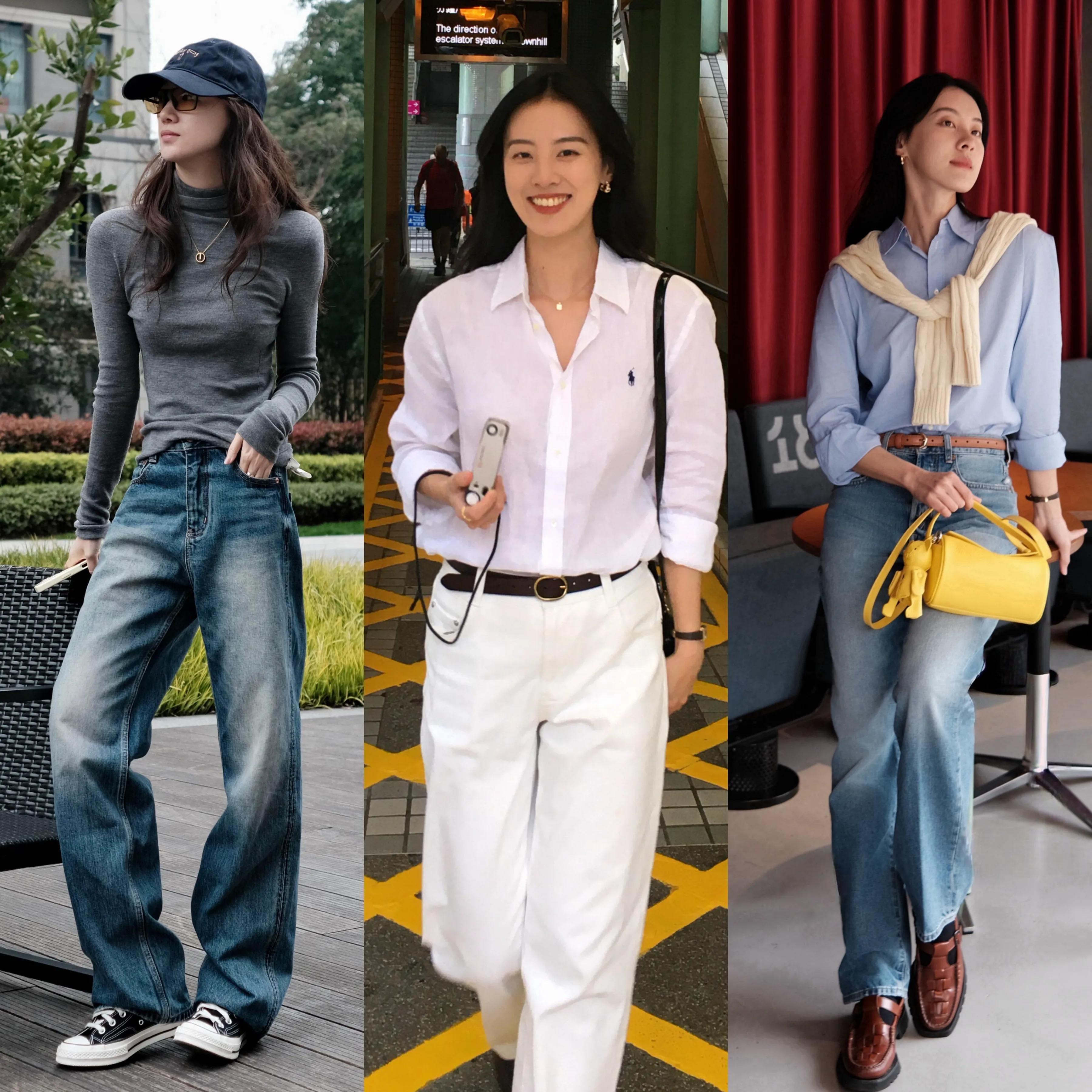 换成一件白色衬衫配上白色牛仔裤,或者是雾霾蓝的衬衫搭配上蓝色牛仔裤,整体穿搭会更加干净利落,耐看还显气质。