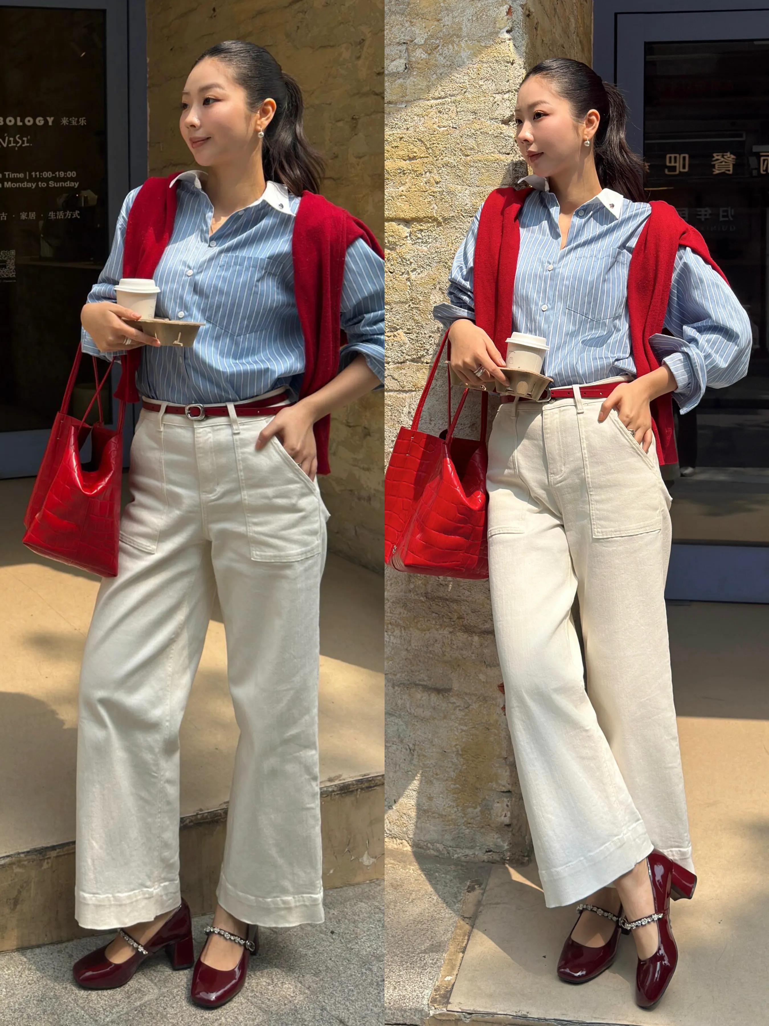 Tips③:白色牛仔直筒阔腿裤+蓝色条纹衬衫