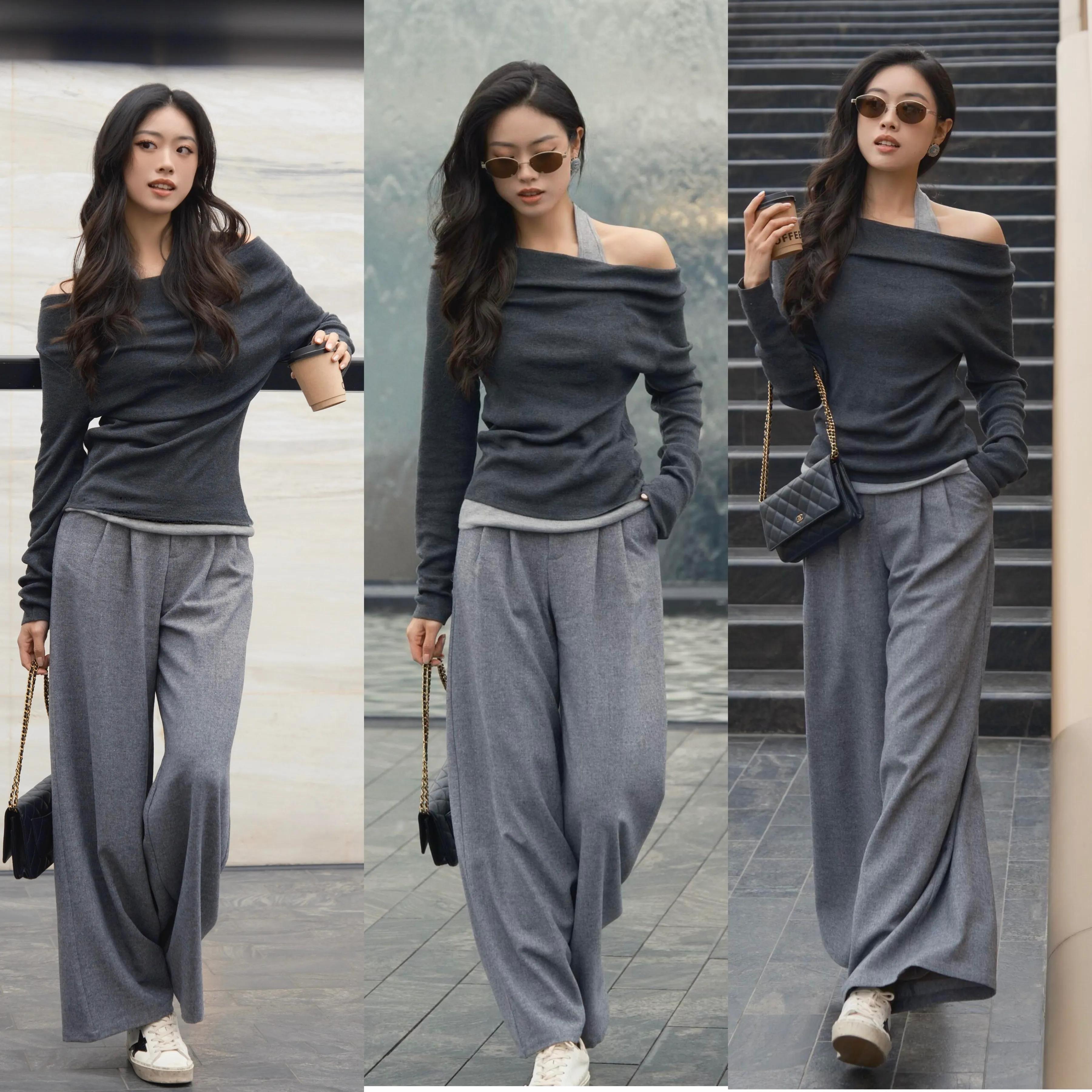 日常出街穿搭,选择一双白色的小板鞋,配上灰色的阔腿裤和灰色的一字肩针织上衣,这样的打扮既舒适又时髦,走再多的路也不会累到脚。