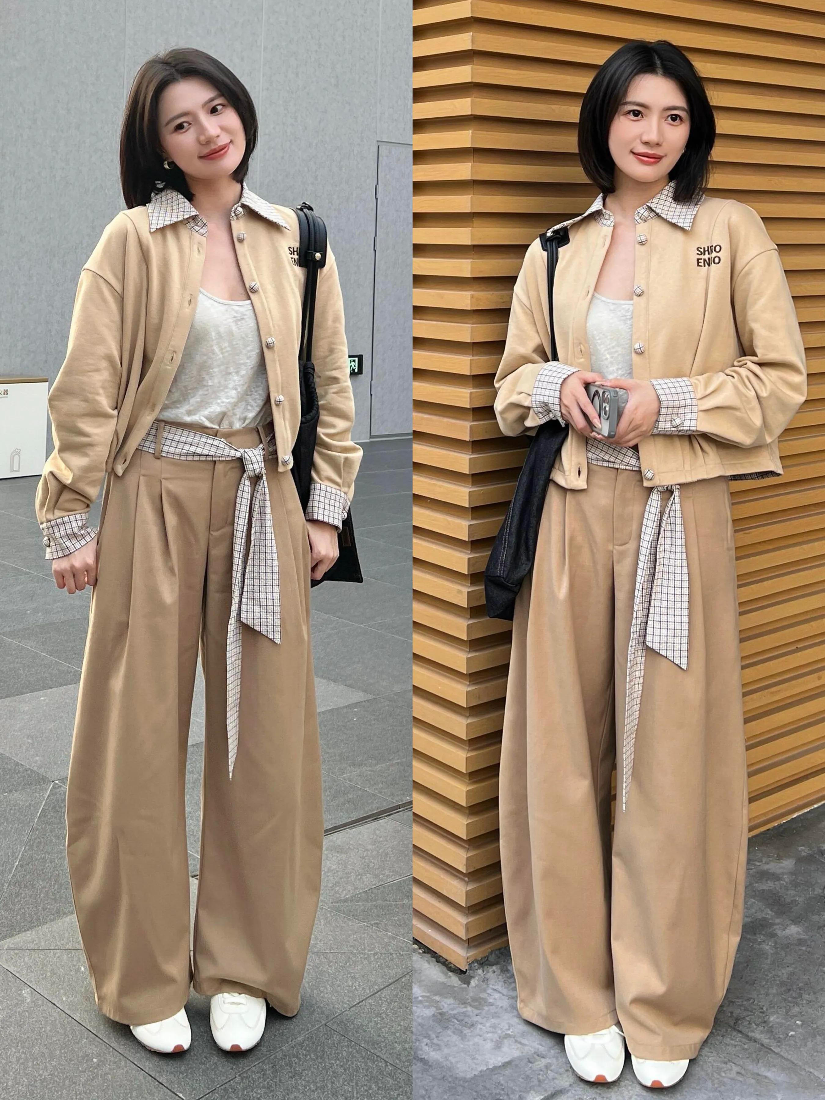或是直接采用上薄下长的穿搭,用一件短款的卡其色外套内搭,白色打底衫和一条卡其色的阔腿裤,脚上穿了一双白色德训鞋,轻松打造随性精致的日常造型,同样也显高显瘦。