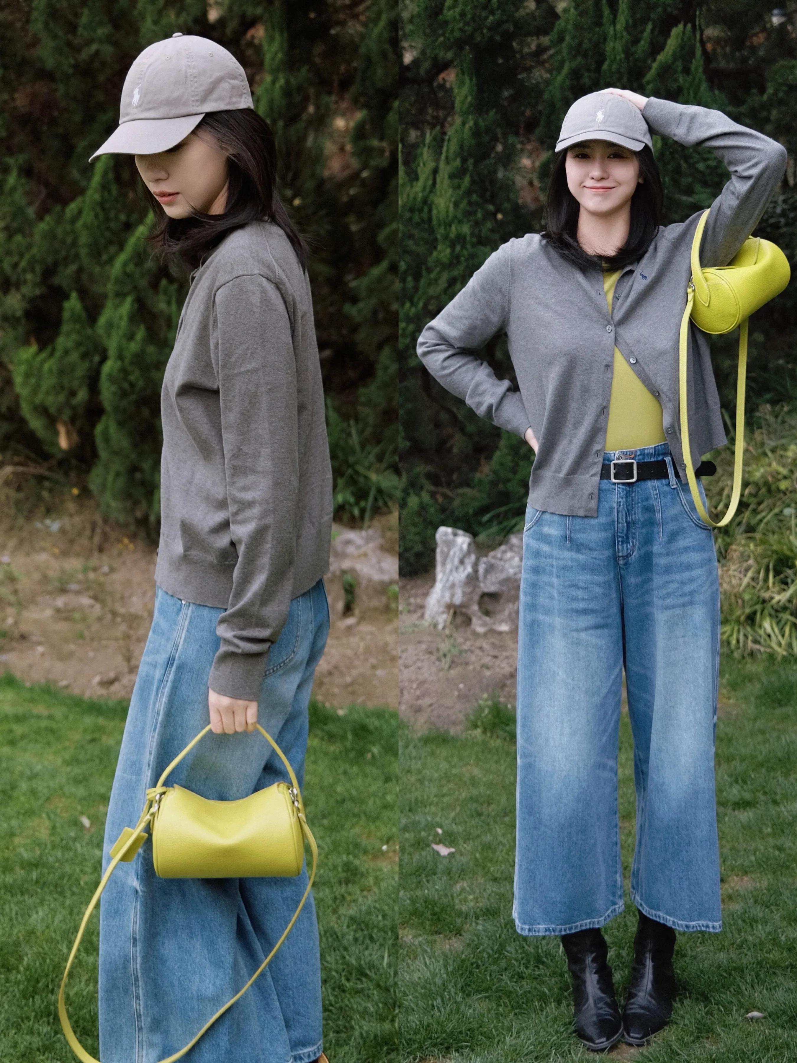平时出门逛个街或者是旅游,那么咱们不妨可以选择一件最基础的灰色针织开衫,内搭牛油果绿针织打底衫,配上一条蓝色的牛仔直筒阔腿裤,脚踩黑色短靴,这样的打扮温柔时尚,拍出来的照片很出片。