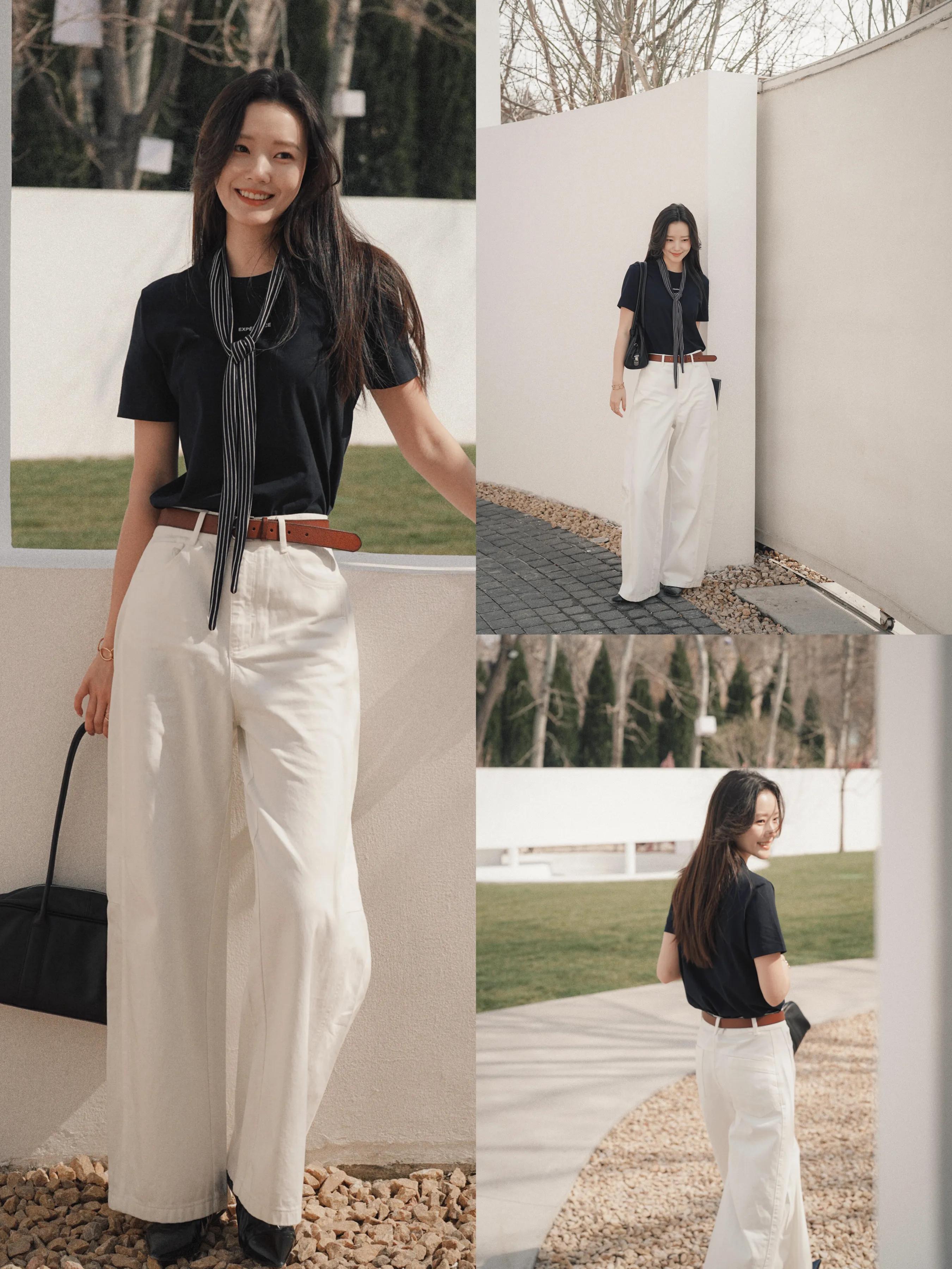 当我们选择一件黑色 T 恤配上白色阔腿裤,脚上就可以选择“黑色尖头低跟单鞋”来穿搭,正好和手里的包包 T 恤形成色彩呼应,让整体配色找到一个平衡点。