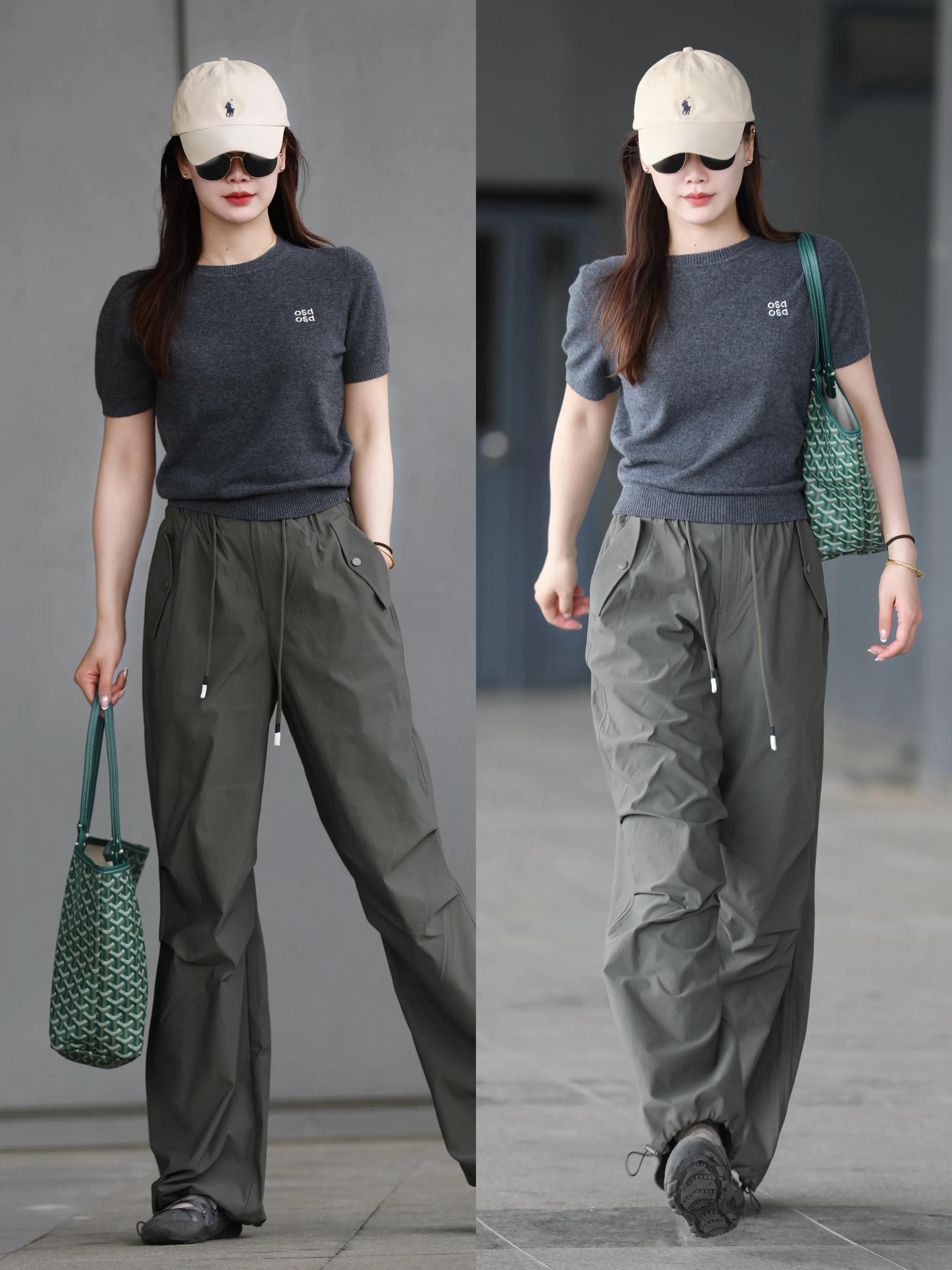 想让自己的穿搭更休闲更日常,我们可以选择一件最基础的灰色针织短袖,穿在身上软糯肌肤,百搭耐看。下半身选择一条工装休闲阔腿裤来穿搭,脚踩灰色德训鞋,戴上卡其色的棒球帽,日常穿搭出门走在街上回头率超高,而且普通素颜照的穿也很美,让自己变成时髦。