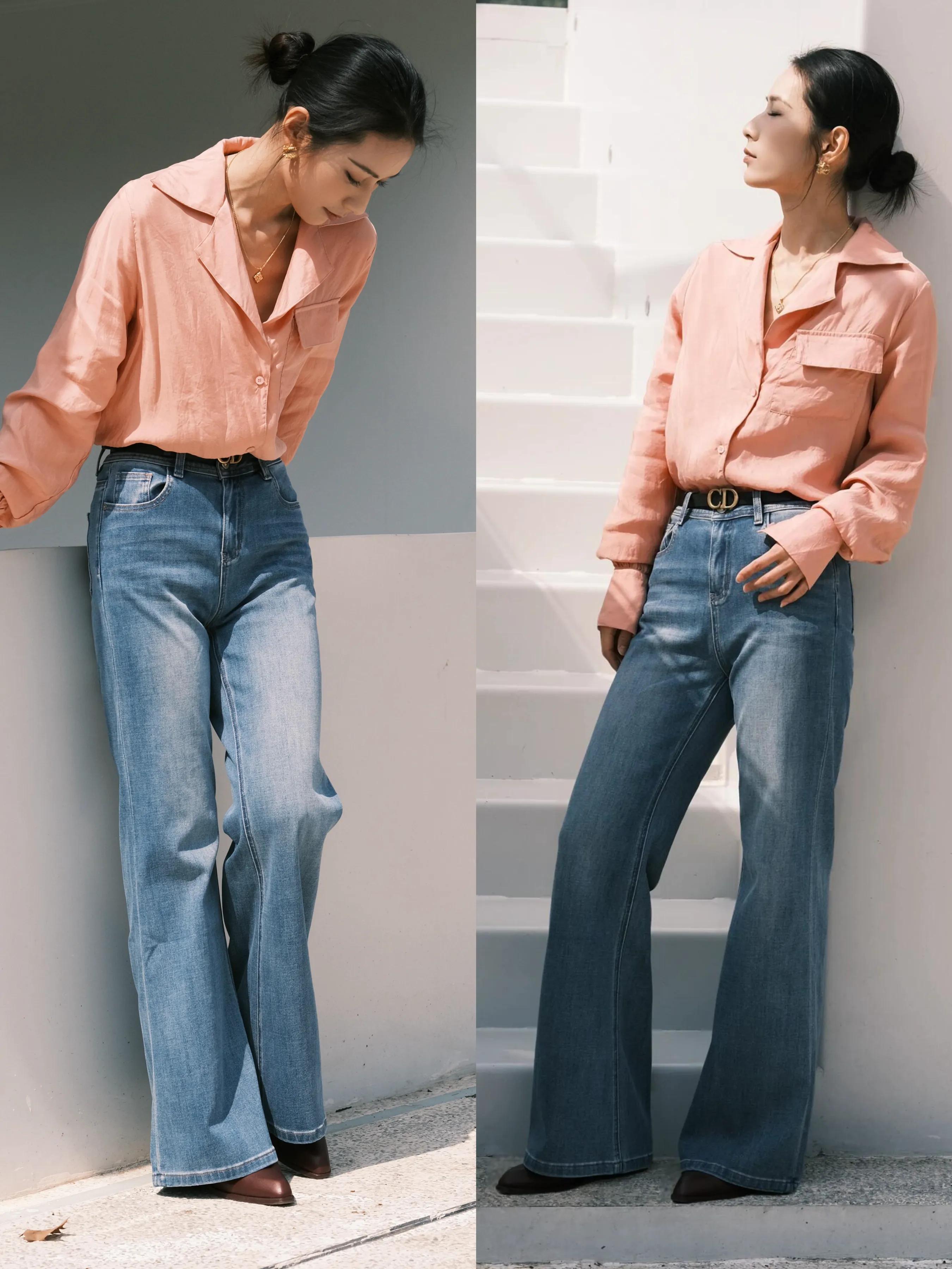 偏爱少女感,不妨可选一件粉色衬衫搭配蓝色牛仔直筒阔腿裤,脚上穿了棕色的低跟单鞋,这样的穿搭少女气息自显,不刻意,不喧哗,让你轻松拿捏整个春日的氛围气息,慵懒随性。