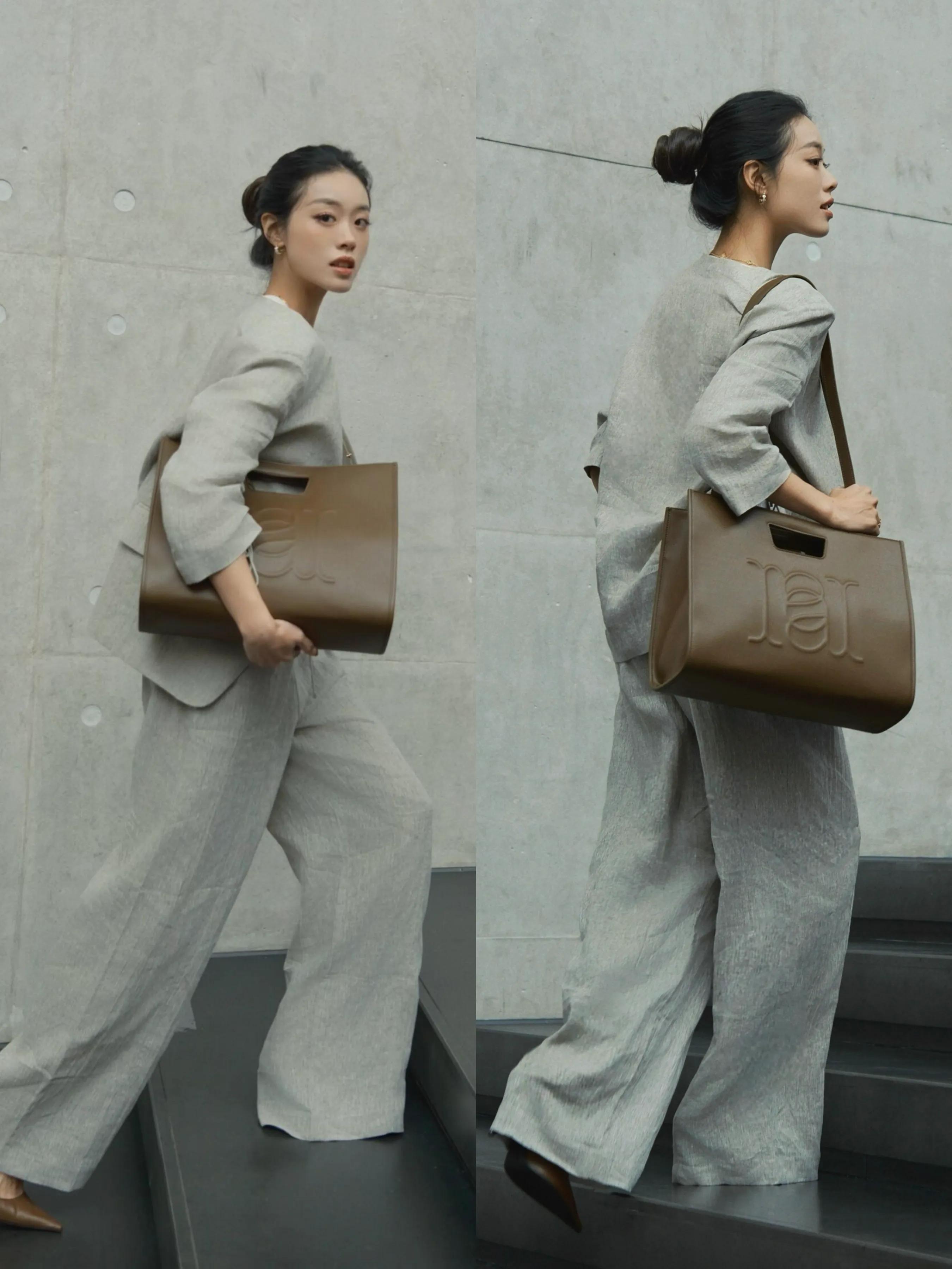 例如,上面这一件经典的卡其色西装外套,配上一条白色的西装阔腿裤,脚踩卡其色的粗跟高跟凉鞋,瞬间就可以打破沉闷与枯燥,让自己变得更有气质,利落大气。