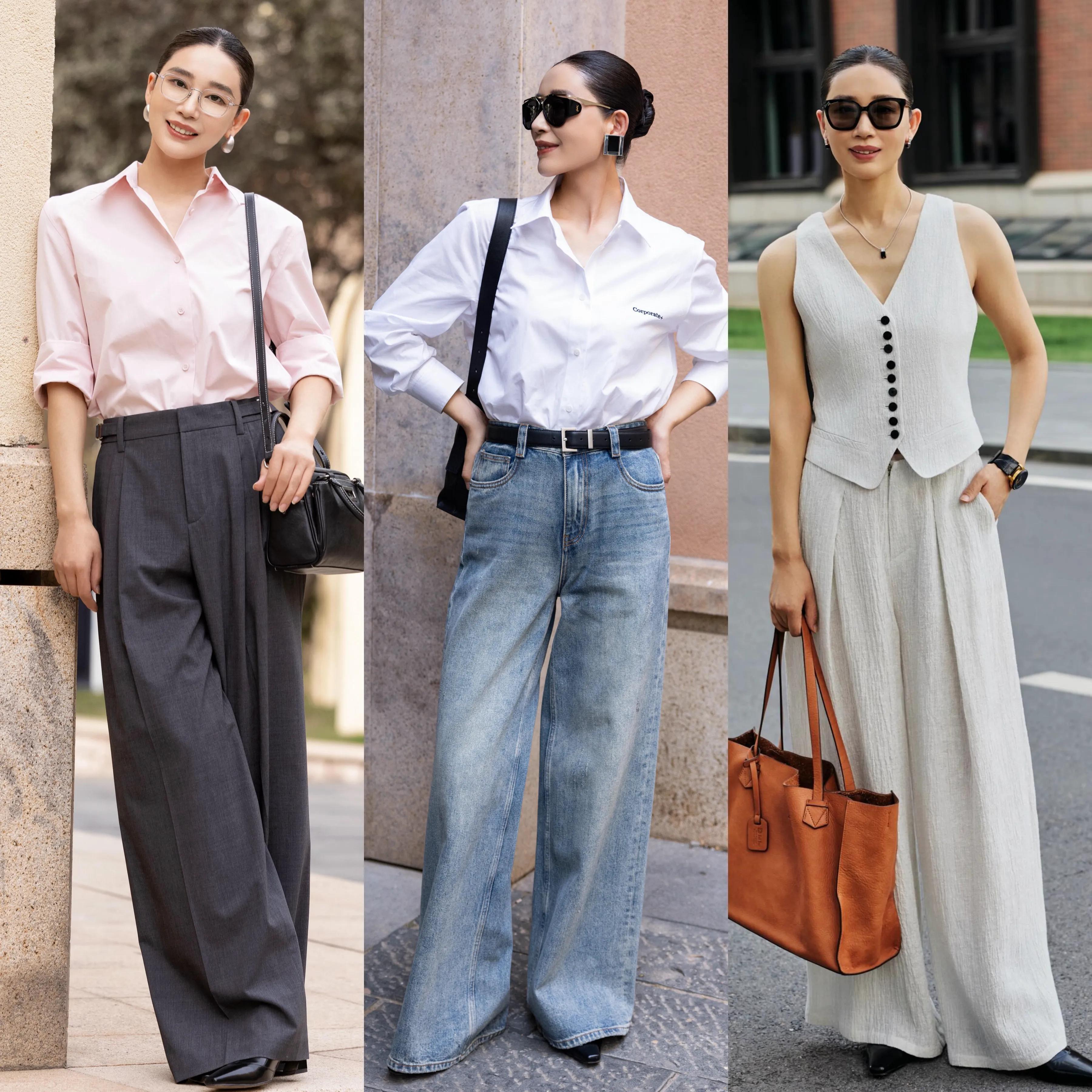 普通素人身材比例,腿部线条无法和博主媲美,有点胯宽腿粗这样的小缺点,穿上一条西装阔腿裤,牛仔阔腿裤,即可把缺点和小困惑藏起来,配上挺阔有型的衬衫或是背心夹克,就可让你拥有流畅的身材线条,让身姿更挺拔。