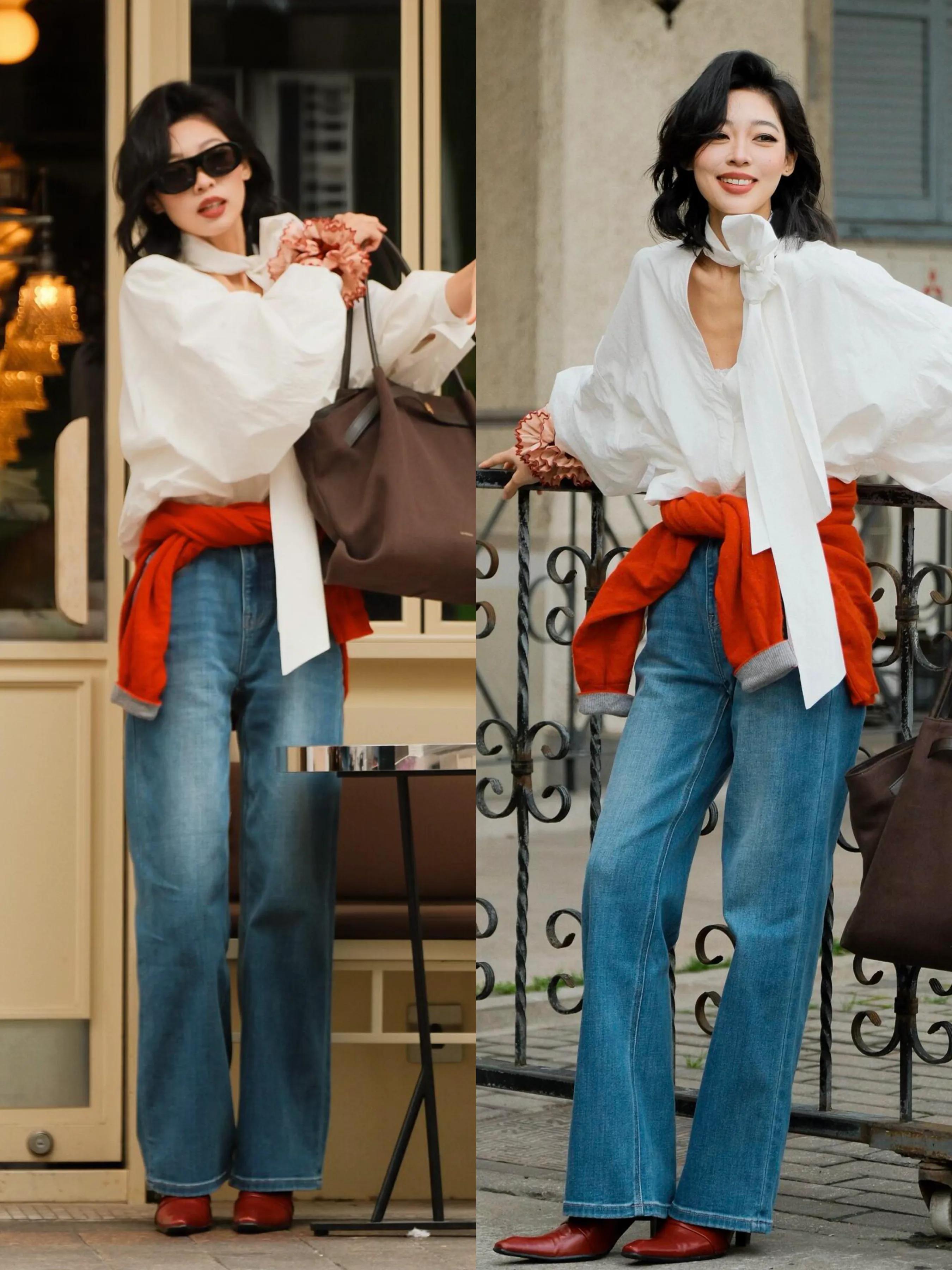 例如上面用灯笼袖的白色衬衫,配上蓝色牛仔直筒阔腿裤,脚踩红色粗跟单鞋,利落显高,还特别的清爽。