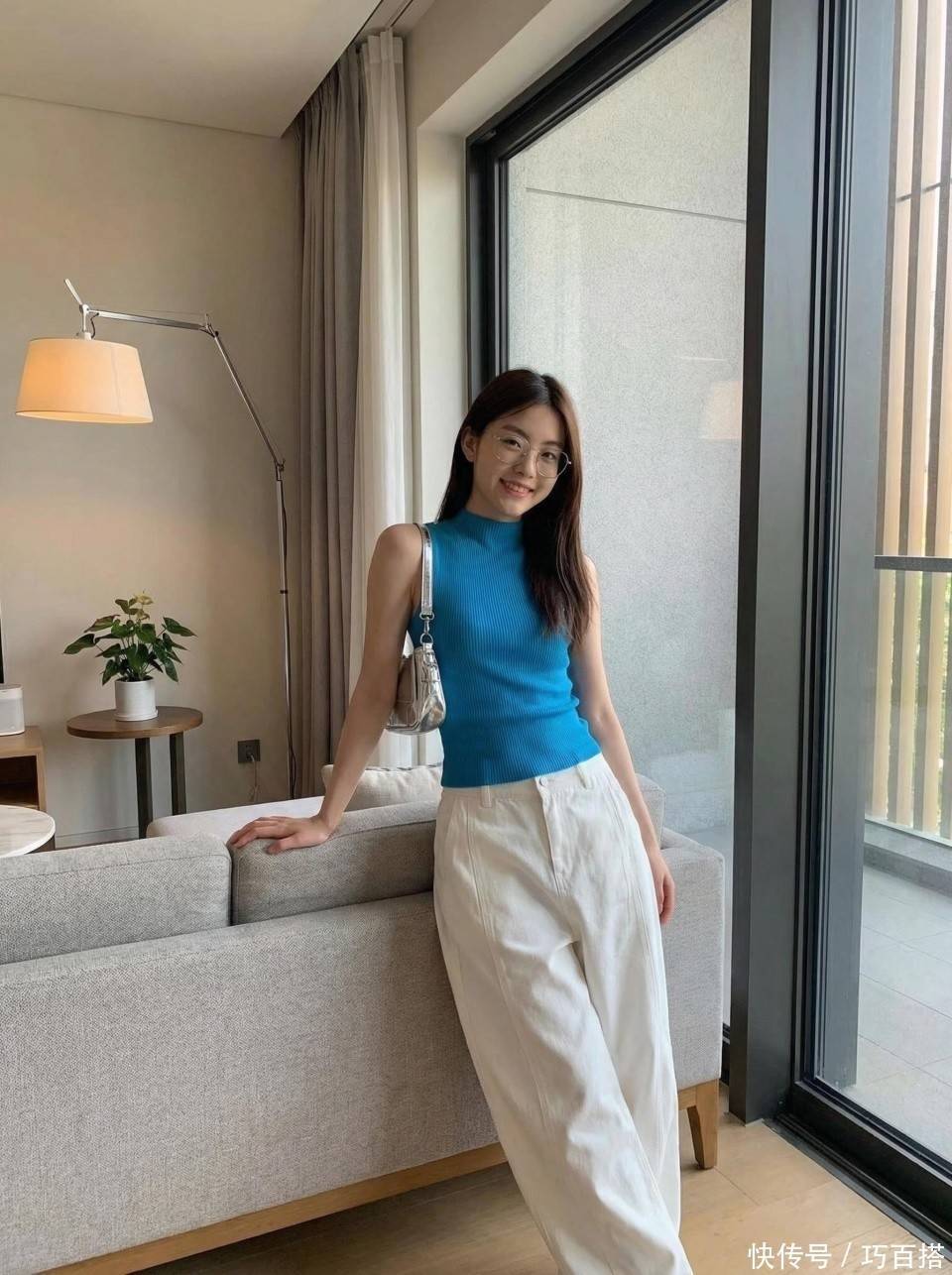 这种需要分两种情况来说,选择白色上衣+蓝色下装的情况下,白色上衣可以选择白色廓形衬衫、白色纯棉T恤、白色吊带背心上身效果也不赖。