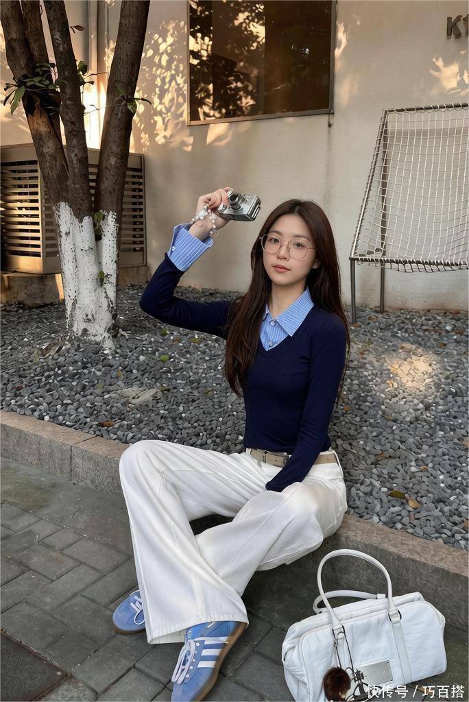 选择深蓝色上衣时,可以考虑针织开衫,像博主身上这类假两件拼接款单品就符合大众审美需求,身材好的姐妹选择紧身款、身材匀称的姐妹选择修身款不会出错。