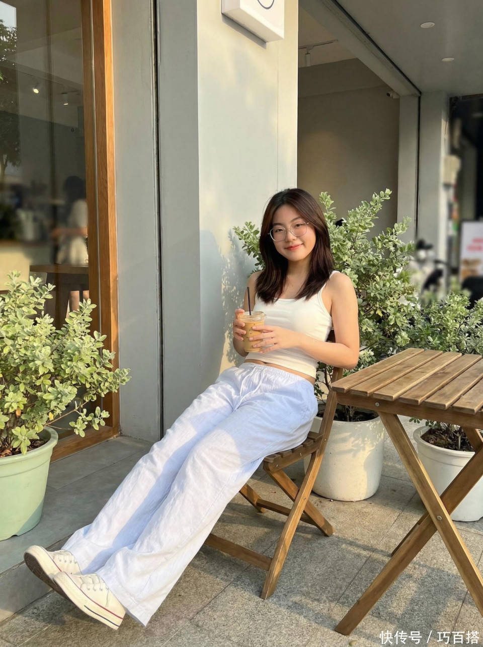 喜欢裤装的姐妹可以考虑天蓝色棉麻材质的休闲长裤,度假风满满轻盈又透气,非常减龄,另外,大家也可以考虑选择水洗蓝牛仔裤与以上提到的白色上衣搭配。